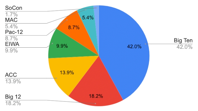 Comparing this season to the average of the last four seasons tells us that the Big 12 and the EIWA are having strong seasons, while the Big Ten and the MAC are slightly down from their recent historical norms.