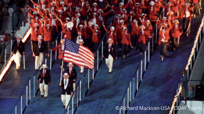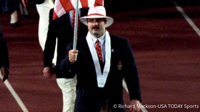 And then here comes our two-time Olympic gold-winning, 13-time world medalist, heavyweight wrestler, New Jersey native Bruce Baumgartner, holding Old Glory in one hand like it's a dang pinwheel, leading the most dominant group of athletes in the history of the world on to our home turf for what was basically the coronation of the American Century.