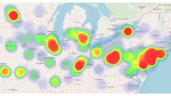 When we focus on the contiguous states, we see the usual hotbeds popping up (apologies to Misters Terao and Roetman for cropping them out). Let's pull in even tighter to check out the northeast and midwest.