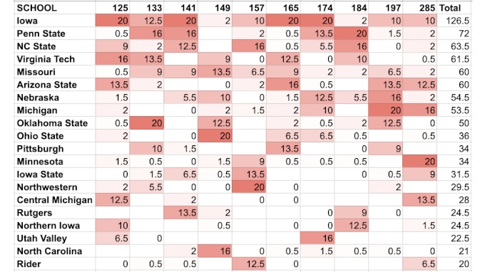 Not quite as large a gap as in our Team Tournament Rankings but Iowa is still the heavy favorite. Breaking out the top 20 by weight class yields the following table.