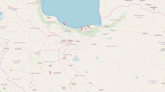 That large body of water peaking in at the top is the Caspian Sea. The cluster of four pins is the city of Juybar. This is where Hassan Yazdani, Amir Yazdani, Kamran Ghasempour, and Mohamed Nokhodi. The lone pin located inland Iran is Alireza Sarlak.