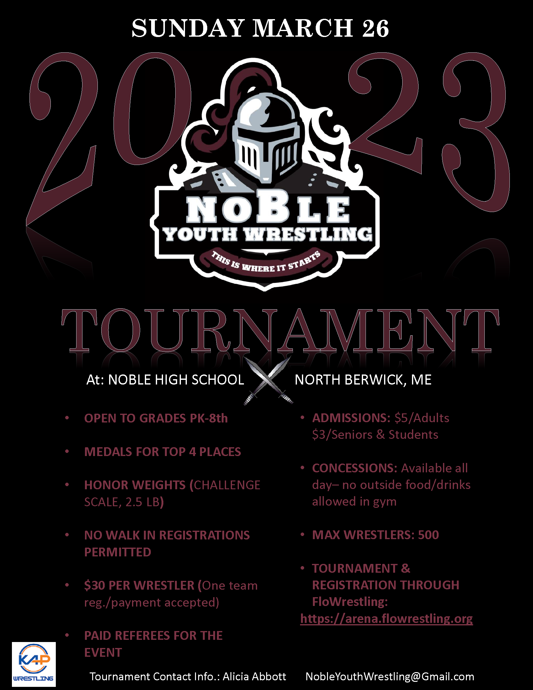 WRESTLING begins on Sunday morning, March 26, 2023 at 8:30 AM for PK-4th grade & 12/12:30 for 5-8th grade and is expected to end before 4:00 PM. The event is being held at Noble High School located at 100 Noble Way, N. Berwick, ME