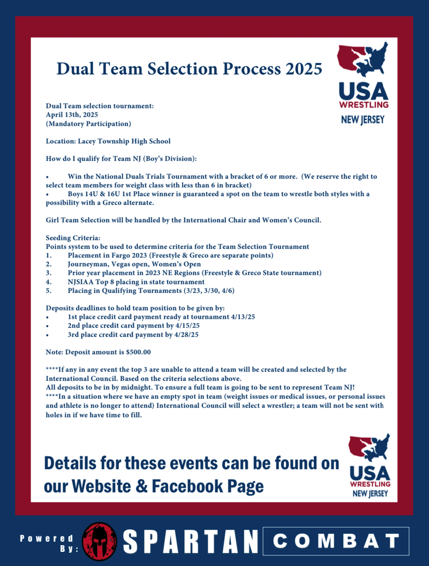 REFUNDS WILL NOT BE GRANTED FOR ANY REASON. A wrestler may change their registration to another Olympic style tournament ONE TIME. After that one time they forfeit their fee and must re-register. PLEASE be sure to choose a wrestler's weight-class for the Qualifier/Team Selection that they can make for an event WHEN REGISTERING.