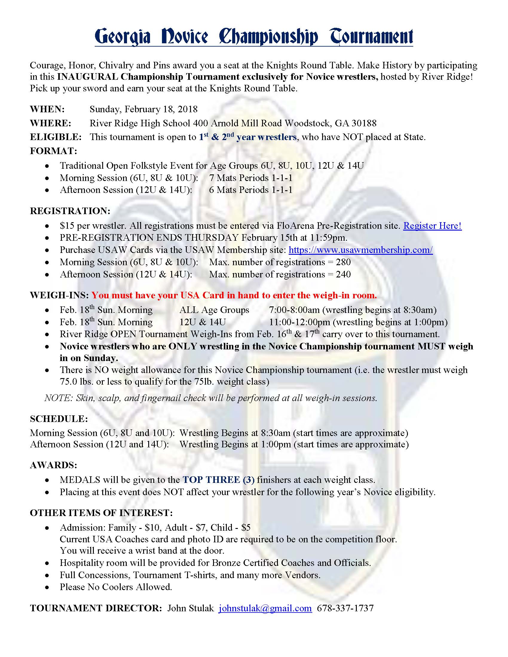No double brackets are allowed in novice tournaments. Please only register for one weight class. Double registrations will be removed and not refunded.