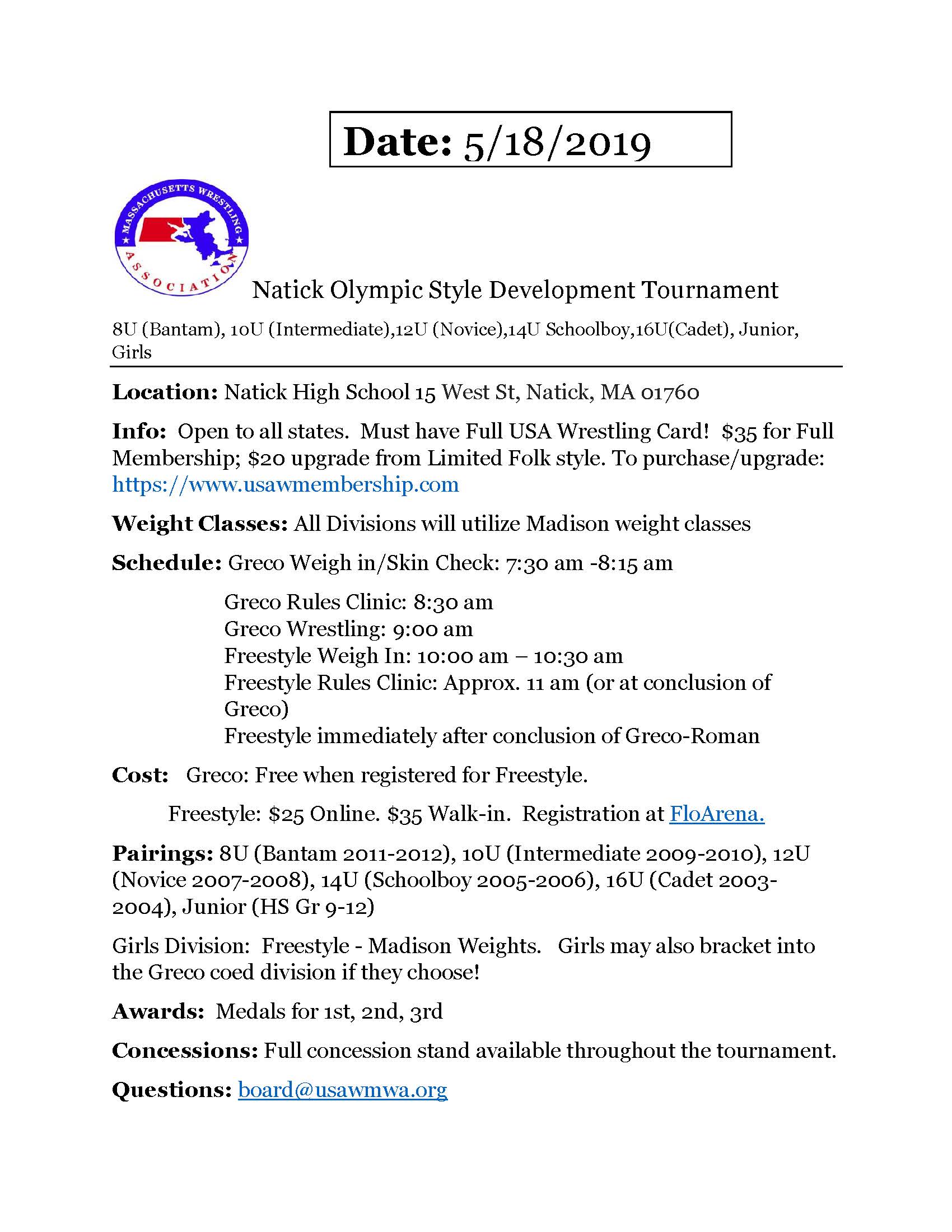 Register for Freestyle and Greco Roman is free. Walkins will be accepted! Be there by 7:15am!