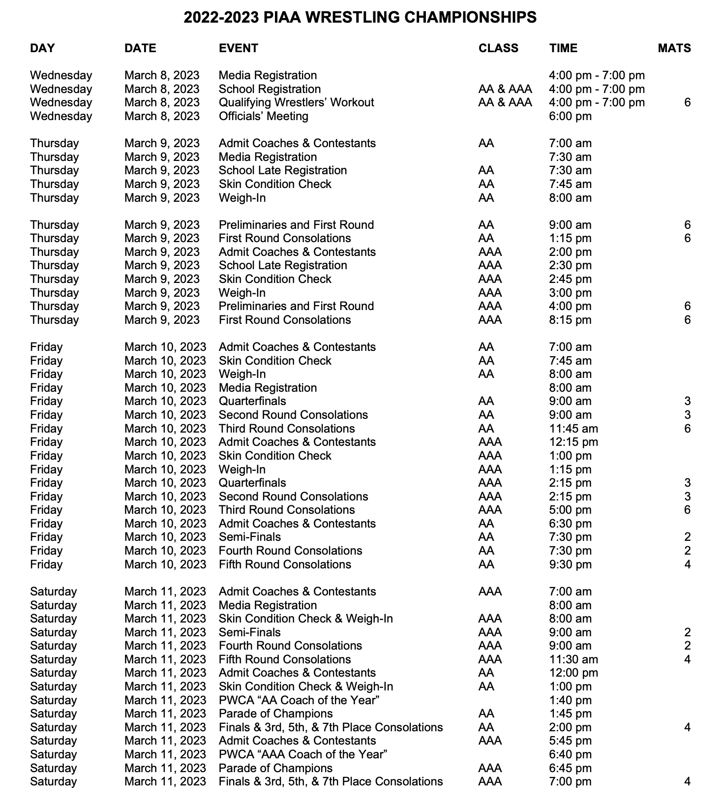 2023 PIAA State Wrestling Championships on Mar 9, 2023 through Mar 11, 2023 in Hershey, PA.